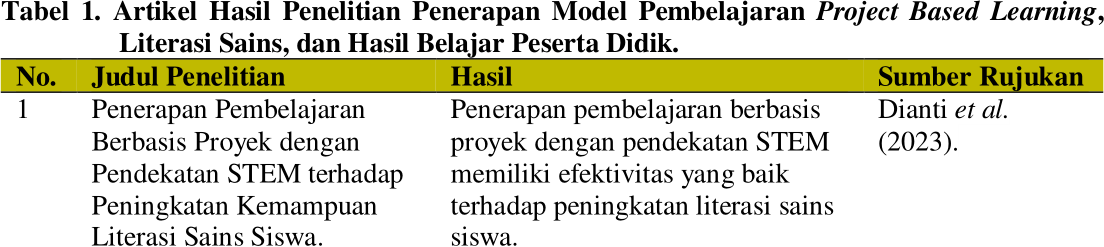 Penerapan Model Project Based Learning (PjBL) terhadap Kemampuan Literasi Sains dan Hasil Belajar Peserta Didik pada Pembelajaran IPA di Sekolah